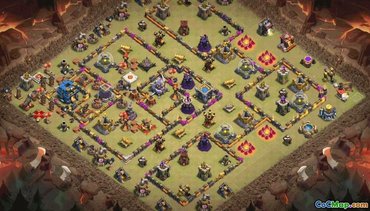 Town Hall 12 players gain a versatile layout designed to perform in home village, trophy pushing, and war scenarios. The core places the Town Hall and key storage behind layered compartments, while an outer ring creates clear funnels to slow enemy progress. The combination of air defenses, X-Bows, and well-timed traps provides solid protection against common TH12 strategies, including lava loon and golem complexes. This base is built to be copied quickly and deployed in seconds.