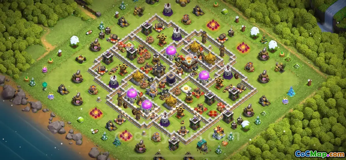 This TH11 farming base features a layout that effectively safeguards resources from raiders. One of the key elements of this design is its strong anti-air capabilities, which are crucial for defending against attackers who utilize Electro Dragons. By placing defenses strategically, players can deter aerial assaults and secure their resources more effectively than with standard base designs.