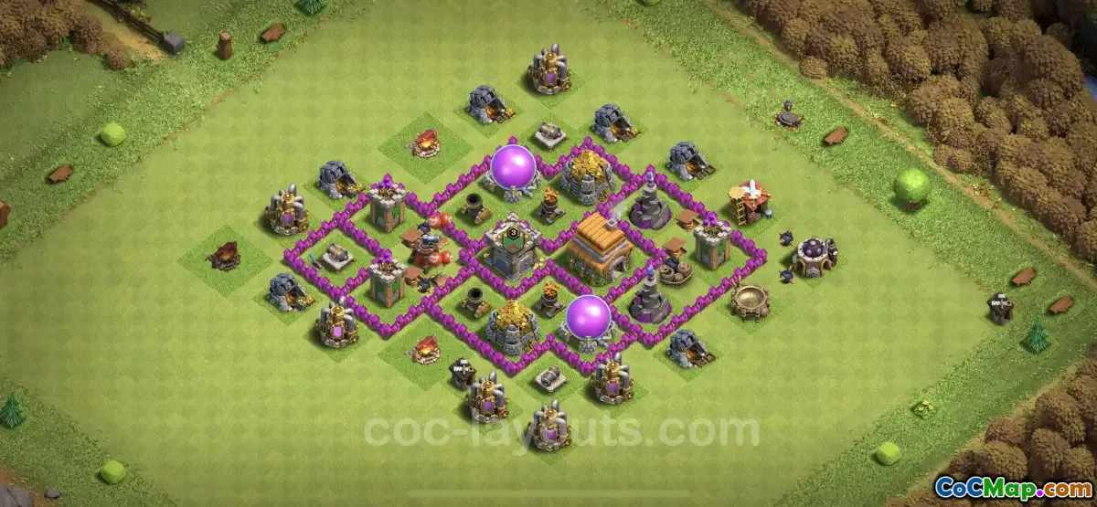 The Farming Base for Town Hall Level 6 in Clash of Clans is specifically designed to maximize resource defense while providing optimal protection for your village. At this level, players can upgrade their buildings and defenses to enhance their gaming experience. The layout includes strategic placement of defense structures to guard against potential resource raids by opponents. This design aims to protect elixirs and gold, which are critical for upgrading and expanding the player’s village further.