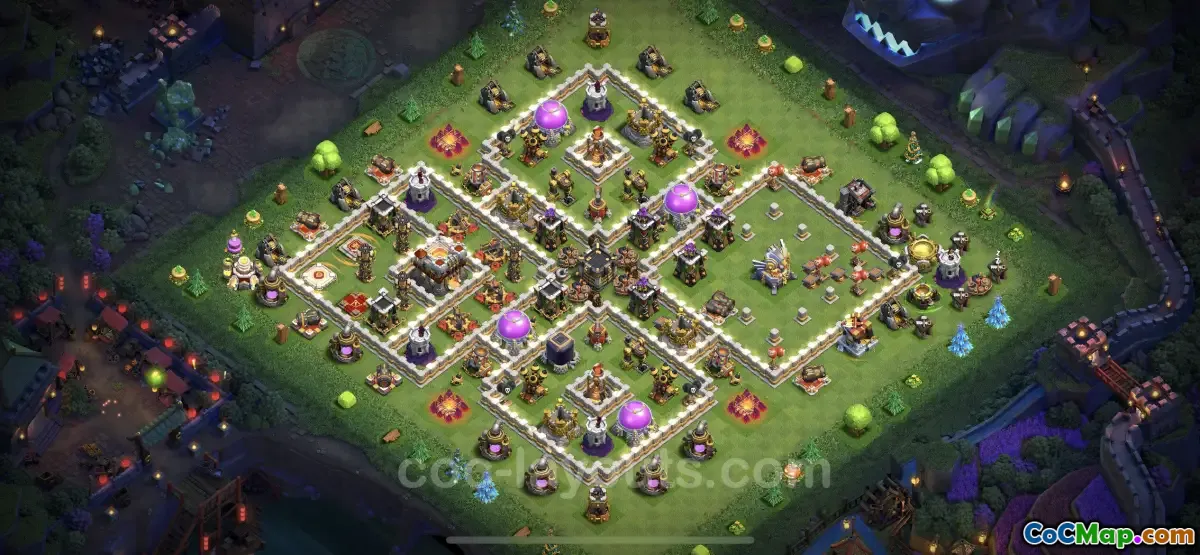 A hybrid max-level base for TH11 incorporates upgraded defensive structures such as cannons, archer towers, and inferno towers. By optimizing the placement of these defenses, players can create a stronghold that minimizes damage from both ground and aerial troops. This design is crucial as players frequently face a variety of attack strategies, and a well-thought-out layout can make a significant difference in successfully defending against them.
