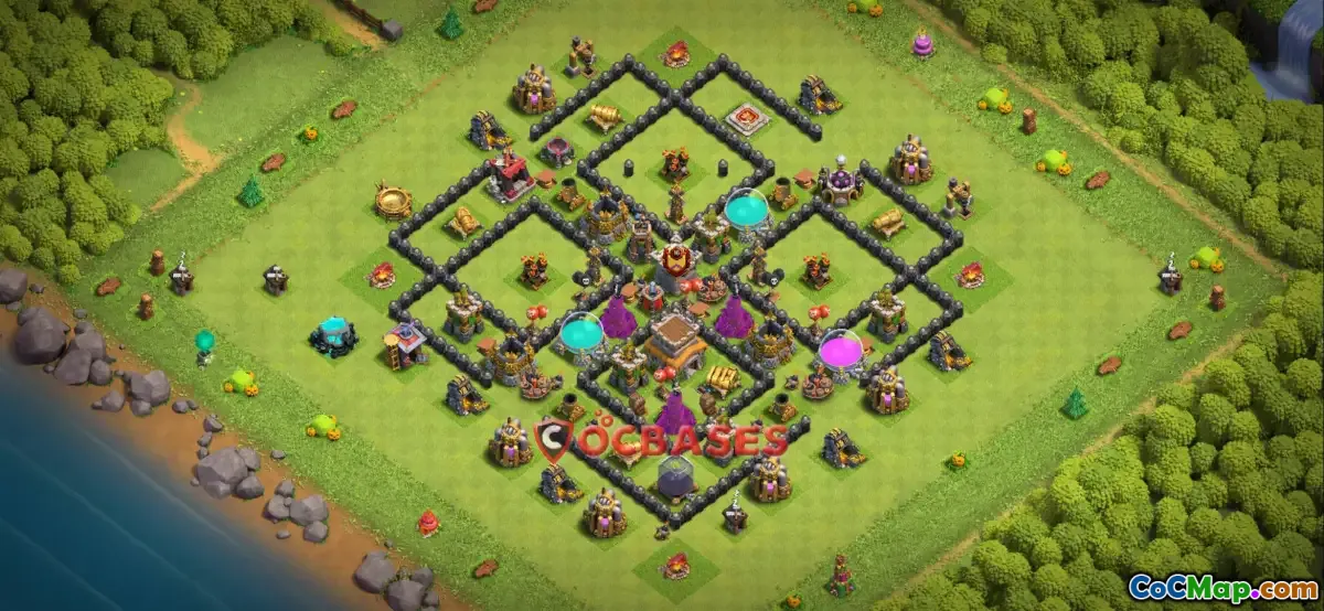 Furthermore, the anti-air and anti-ground strategies in this base design are tailored to counter the common threats encountered at Town Hall 8. With the inclusion of various defensive structures positioned to target airborne units, the base can neutralize dragons, balloons, and other air attacks. At the same time, ground defenses are strategically placed to deal with the likes of giants, wizards, and hog riders, making the base robust against multiple attack forms.