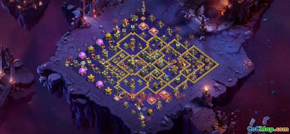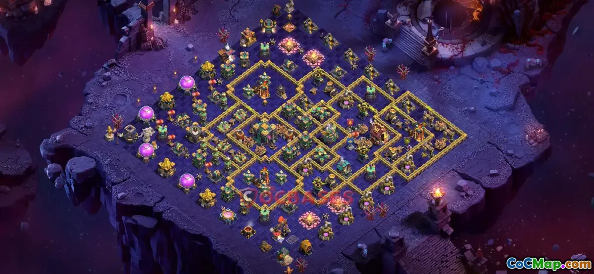 This Town Hall 14 war base design is a meticulously crafted layout that offers maximum protection for your resources and Clan Castle. Featuring well-placed defenses and strategic traps, this base minimizes the impact of powerful attacking strategies, making it ideal for clan wars and war leagues.