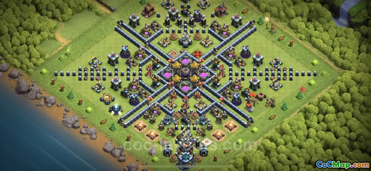 This farming base layout is strategically crafted to ensure that valuable resources are well-guarded. The placement of defensive structures, traps, and resource storages is meticulously planned to create challenges for opponents attempting to raid. By using this base design, players can significantly reduce losses during attacks and improve their overall farming experience by keeping their resources intact for upgrading troops and buildings.