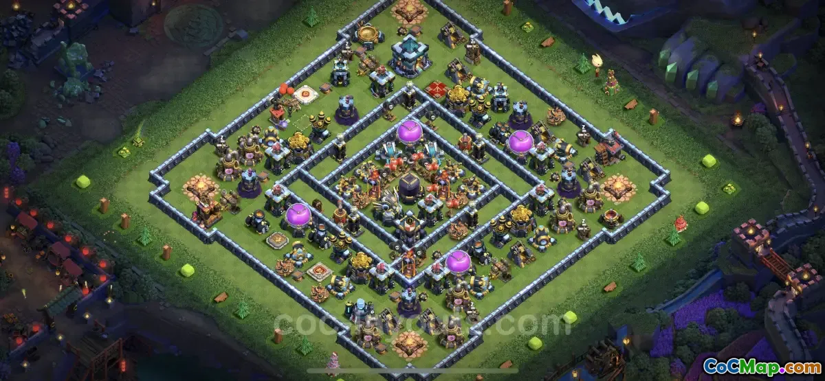 The Farming Base TH13 is a design specifically created for Clash of Clans, focusing on resource defense at Town Hall Level 13. This layout is engineered with an emphasis on protecting all types of resources from enemy attacks, ensuring that players can safeguard their hard-earned resources effectively. It employs strategic placements of defenses to thwart various forms of attacks, making it a robust choice for farmers who prioritize resource preservation over trophies.