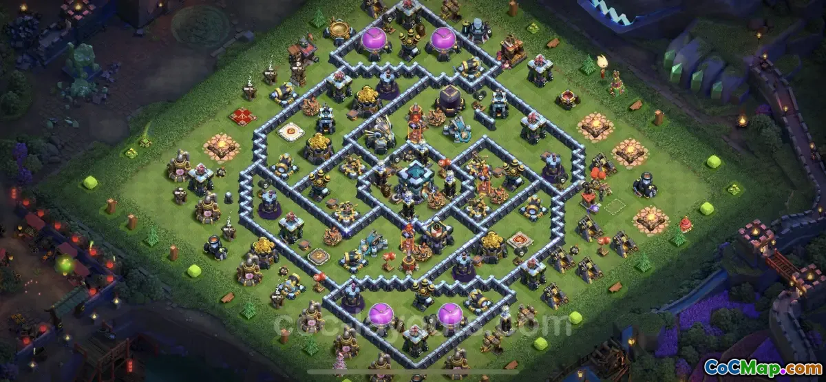 The Farming Base for Town Hall Level 13 in Clash of Clans is designed to effectively protect resources while minimizing the risk of being three-starred by opponents. This layout is especially beneficial for players focusing on farming, as it strategically positions buildings and defenses to safeguard their collected resources. With careful planning, the base provides formidable defense against various attack strategies commonly used in the game.