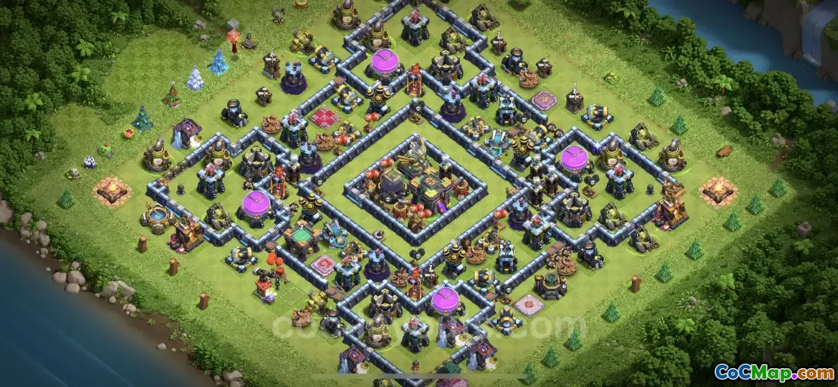 This particular base design integrates a hybrid strategy, which means it balances both defense and resource collection. The use of hybrid layouts is advantageous in Town Hall 14, as it allows players to withstand attacks while still efficiently gathering resources needed for upgrades and improvements. With the inclusion of anti-air measures, players can create a formidable defense against air attacks, which are increasingly common in higher-level gameplay.
