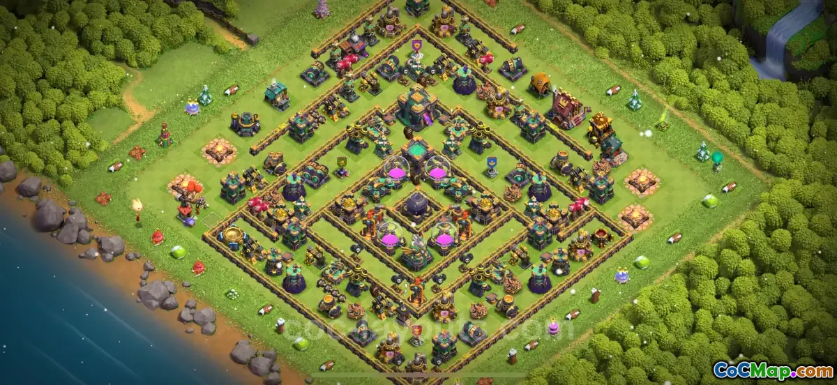 This 2025 TH14 base design features a hybrid approach, combining elements that cater to both resource defense and troop versatility. The strategic placement of defensive buildings encourages attackers to spread out their forces, thereby making it harder for them to achieve a decisive victory. Additionally, by utilizing traps and walls effectively, the base creates a layered defense that complicates the attacking strategy, especially for those relying on air assaults.