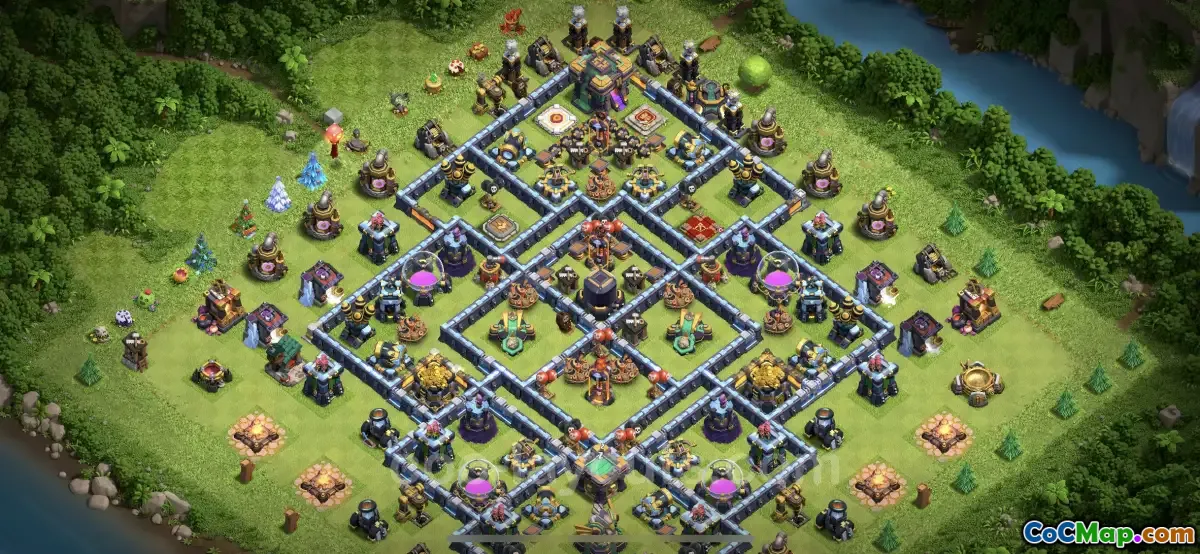 Moreover, the base is available for players to copy directly, facilitating quick implementation of the design. Each element of the layout has been carefully considered to create an optimal balance between defending against ground and air units. Players can utilize this base not only to defend their resources effectively but also to manage their overall defensive strategy in the game. This makes the Farming Base TH14 a valuable asset for any Clash of Clans player focused on resource management and defense.