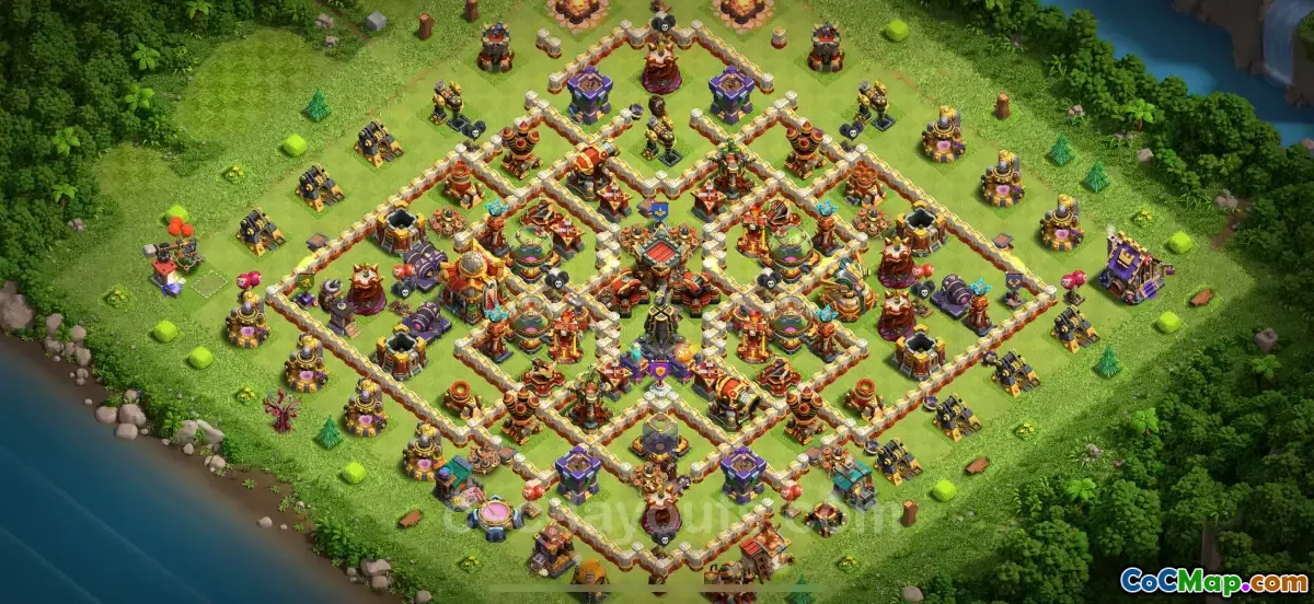 This TH16 Trophy Defense Base for 2025 centers Town Hall 16 at the core and uses multiple protective rings to deter early 3-star attempts. The skeleton relies on strong walls and well-spaced defenses to direct attackers into trap zones while preserving key defensive buildings. It is designed for trophy collection and comes with a copy-ready base code, enabling quick import into your account for fast setup and consistent results.