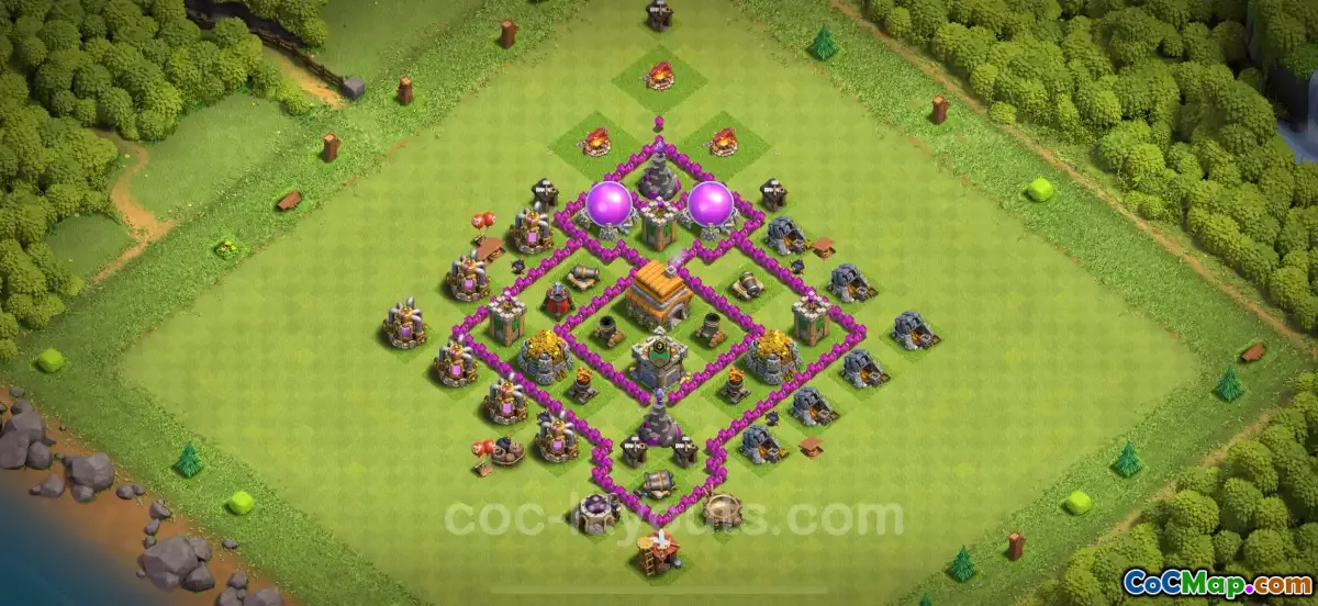 TH6-basen med länk för troféinsamling i Clash of Clans (COC) är designad speciellt för spelare på stadshusnivå 6. Denna baslayout fokuserar på att effektivt försvara sig mot fiendens attacker samtidigt som den hjälper spelare att samla troféer. Den strategiska placeringen av byggnader och försvar är avgörande för att bevara resurser och upprätthålla ett bra antal troféer, vilket är avgörande för att gå vidare i spelet.