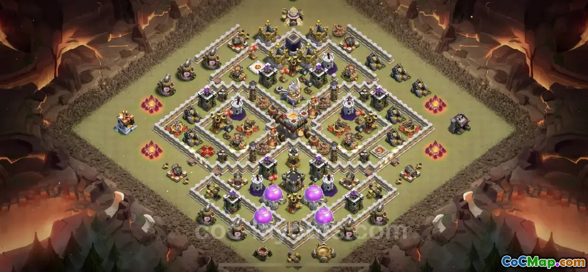 This TH11 base incorporates various defensive mechanisms and traps that target air units, making it particularly potent against aerial assaults. The layout focuses on protecting the Town Hall and key resources from being easily reached. Additionally, the design leverages the unique capabilities of buildings like the Eagle Artillery, Inferno Towers, and Clan Castle to provide a solid defensive line against even the most formidable enemy strategies, ensuring a robust defense during war scenarios.