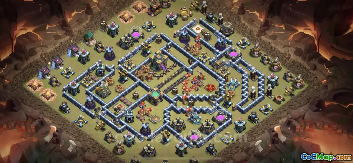 The best war base for TH14 players incorporates specific design elements that counter popular attack strategies. They feature centralized key defensive structures, such as the Eagle Artillery, Inferno Towers, and Scattershots, which are pivotal in repelling enemy forces. These structures are encased within walls to slow down enemy troops, forcing them to navigate through multiple layers of defenses. Additionally, traps such as spring traps, giant bombs, and seeking air mines are strategically placed to catch attackers off guard and significantly reduce their chances of success.