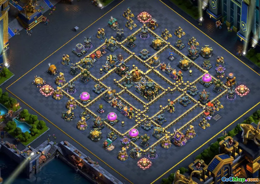 Looking for a strategic Town Hall 17 base layout? This copyable design offers optimal defense for your home village, trophy pushing, and clan wars. Its well-placed defensive structures and traps ensure durability against various attack strategies.
