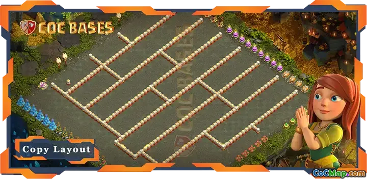 I denna design är väggarna organiserade i distinkta rader, vilket ger en unik visuell attraktion. Byggnader är strategiskt placerade mellan dessa väggar, vilket skapar ett nyckfullt arrangemang som kan förvirra eller roa motståndare som försöker bedöma layouten. Det primära fokus ligger på estetik snarare än de typiska defensiva strategier som spelare ofta använder när de bygger sina baser.