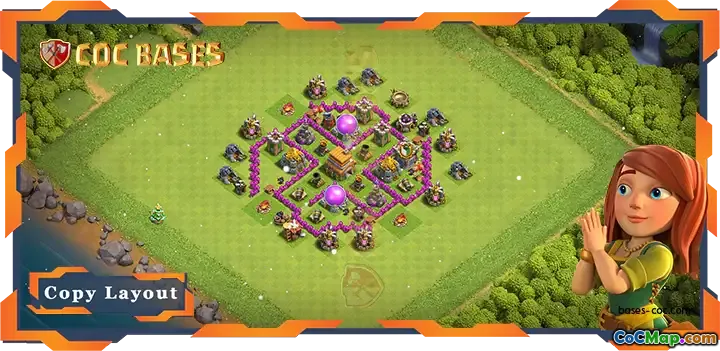 The hybrid base design for Town Hall level 6 (TH6) in Clash of Clans is structured to effectively balance both farming and defense. This layout is specifically tailored to protect resources while ensuring that the Town Hall remains secure. Central to this base layout is the Town Hall, which is strategically placed in the middle of the base to offer maximum protection against enemy attacks.