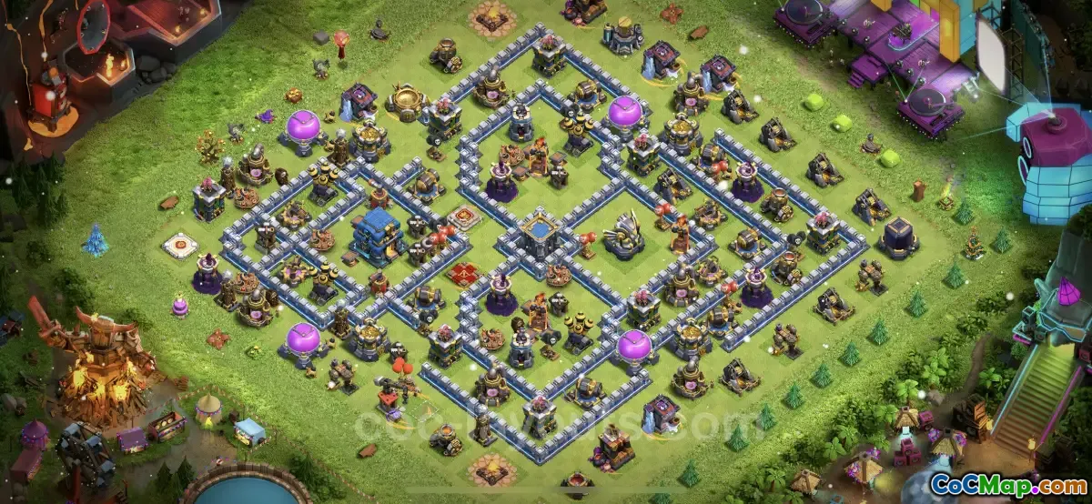 This top-tier design for an Anti Air TH12 Base showcases unique features that make it a formidable option in defending against various attacks. The placement of buildings is meticulously planned to ensure that air units, especially dragons, are engaged early in their approach. By positioning air defenses such as air sweepers, air bombs, and seeking air mines strategically throughout the layout, players can create a defensive wall that proves challenging for aerial attackers to penetrate.