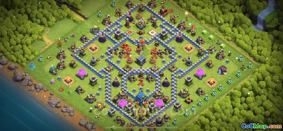 One of the key features of this base design is its anti-air capabilities, which are essential for countering aerial units, particularly the electro dragon and other dragon types that are often used in attacks at higher levels of play. By effectively incorporating defensive buildings that target air units, the base aims to protect the player's Town Hall from being easily taken down, thereby preserving trophies and rank in the Legend League.