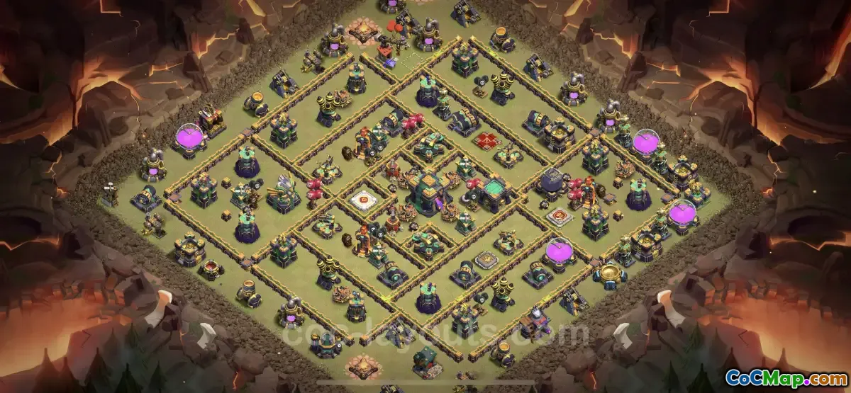 The base layout includes various defensive structures and traps placed in a manner that maximizes their effectiveness against different types of units and attack strategies. Its construction takes into account common tactics used by attackers at Town Hall 14, thus offering a robust defense against ground and air troops. This guarantees that players who utilize this base design can have confidence in their defenses during attacks from rival clans, effectively securing wins during crucial league matches.