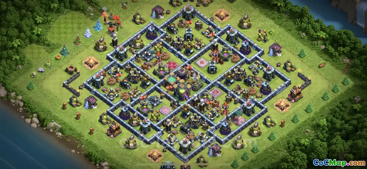 Discover the best unbeatable TH14 base designs! Explore our top hybrid layouts for Town Hall 14, equipped with anti-loot defenses & links to copy.