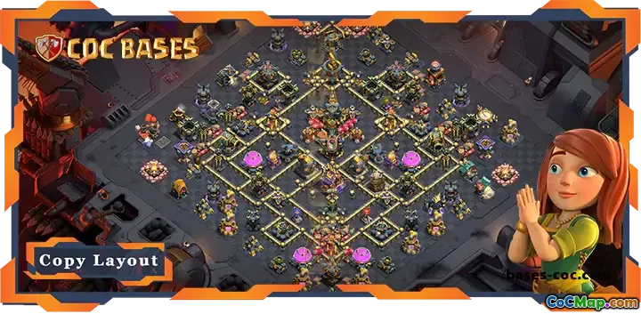 This Top War Base TH17 layout is expertly designed to withstand attacks from all angles, offering strong defense structures, well-placed traps, and strategic positioning of defenses to counter various attack strategies. It incorporates anti-everything tactics, making it highly resilient against popular attack methods such as Lavaloon, Queen Walk, and mass miner raids, ensuring your Clan’s victory in Wars.