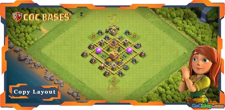 I denna speciella basdesign för Stadshuset Nivå 5 (TH5) är layouten fokuserad på en hybridjordbruksstrategi. Det primära syftet med denna layout är att skydda resurser och samtidigt försvara sig mot attacker. I kärnan av basen ligger stadshuset centralt, vilket är en strategisk placering. Denna centrala positionering möjliggör bättre skydd eftersom den minimerar chanserna för motståndare att lätt nå och förstöra den.