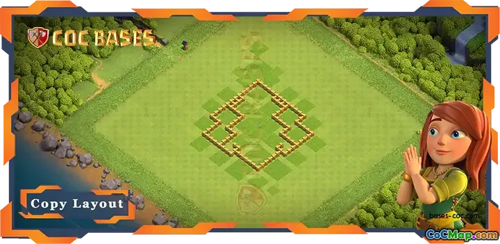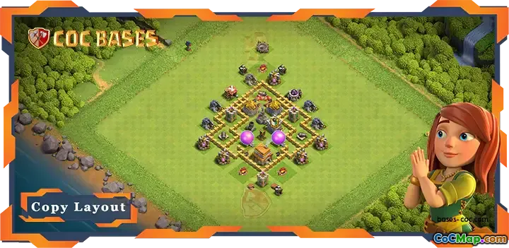Baslayouten som beskrivs som TH5 är optimerad för jordbruksändamål i en spelmiljö. Centralt i denna layout är stadshuset, strategiskt placerat i mitten av basen. Runt stadshuset finns viktiga defensiva strukturer, inklusive ett klan-slott, ett trolltorn, flera förvaringsutrymmen för elixir och guld och olika defensiva vapen. Detta noggranna arrangemang syftar till att skydda viktiga resurser och säkerställa ett robust försvar mot inkommande attacker.