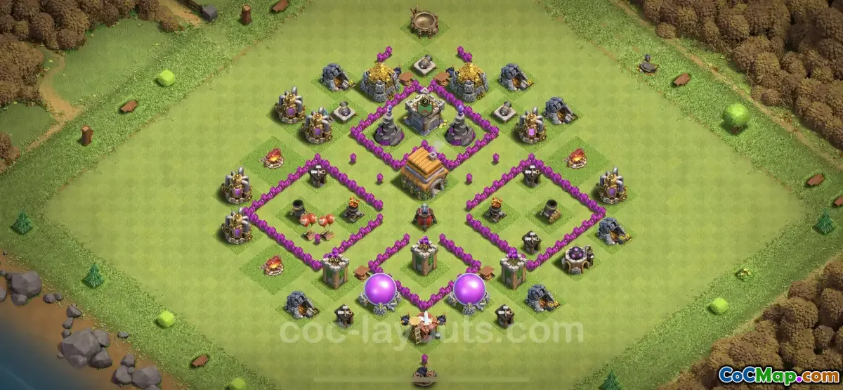 Utformningen av en anti-allt TH6-bas inkluderar vanligtvis ett centralt fack som inrymmer rådhuset och de flesta kritiska försvar. Genom att placera rådhuset i en säker position omgiven av försvarsbyggnader som kanoner, bågskyttetorn och trollkarlstorn kan spelare skapa ett formidabelt hinder för angripare. Denna strategiska placering tvingar fiender att använda fler trupper och resurser för att penetrera de yttre försvarsskikten.