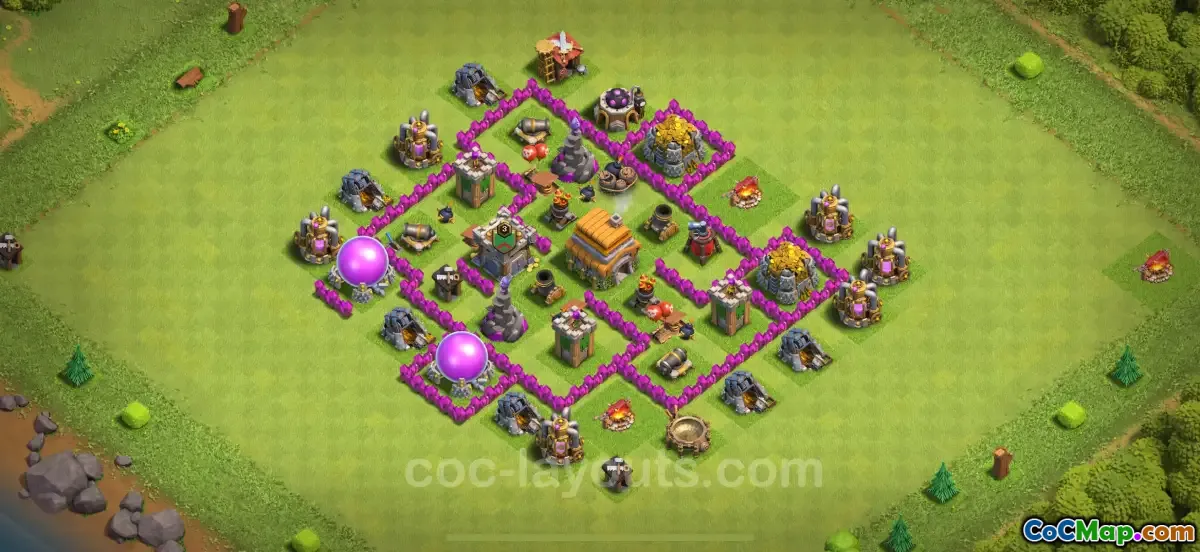 En nyckelfunktion för Town Hall 6-basen är layouten, som vanligtvis är centrerad kring själva stadshuset, vilket säkerställer att det är väl skyddat och inte lättillgängligt för angripare. Denna design inkluderar ofta en ring av defensiva byggnader, såsom kanoner, bågskyttetorn och granatkastare, som ger en robust frontlinje mot fiendens trupper. Målet är att avskräcka motståndare och minimera mängden troféer som förloras under attacker, samtidigt som det ger ett stabilt försvar för resurser som lagras i basen.