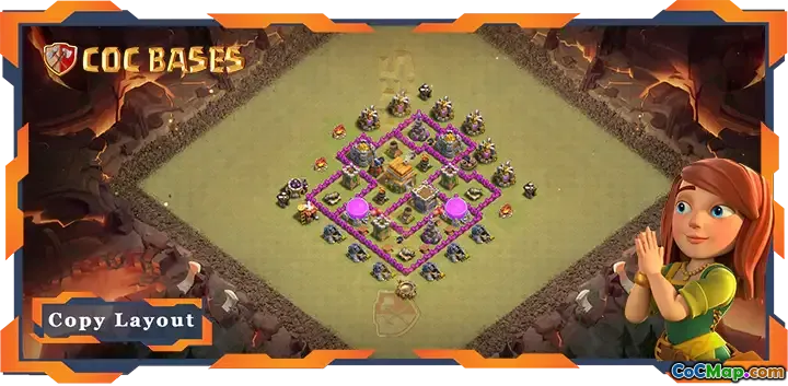 This top TH6 war base features a balanced hybrid layout that effectively counters both air and ground attacks. Its strategic placement of defenses and traps creates a robust barrier around the Town Hall, making it difficult for enemies to reach the core quickly.