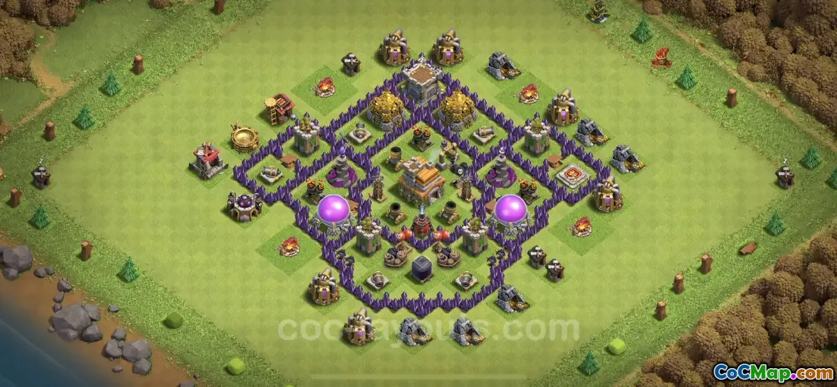 Förutom anti-drakåtgärder, innehåller denna TH7-bas också olika fällor och försvar för att mildra markangrepp. Medan det primära fokus ligger på luftförsvar, ger en balanserad design som kan avvärja både luft- och markenheter ytterligare ett lager av skydd. Strukturer som trollkarlstorn, bågskyttetorn och luftvärn är placerade för att täcka varandra, vilket skapar överlappande inflytandeområden som avskräcker angripare från alla vinklar.