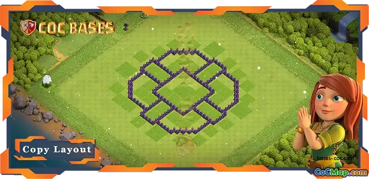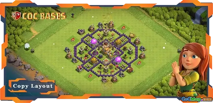 Sammanfattningsvis är denna flersektionslayout för TH7 designad med både försvar och resurshantering i åtanke. Genom att centralisera stadshuset och integrera flera defensiva strukturer runt det ger basen ett robust försvar mot attacker samtidigt som det underlättar effektiva jordbruksmetoder. Det genomtänkta arrangemanget av murar och försvar bidrar till att skapa en formidabel utmaning för motståndare, vilket säkerställer skyddet av värdefulla resurser också.