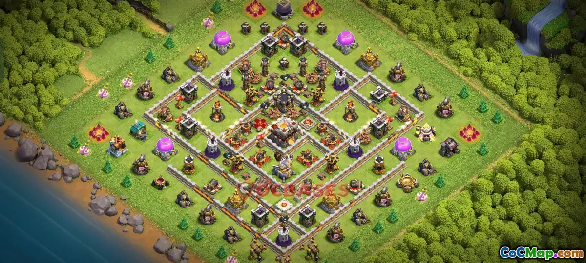 De starka egenskaperna hos denna krigsbas i Town Hall 11 härrör från dess väl genomtänkta layout, som betonar vikten av säkerhet för viktiga strukturer som rådhuset och klanborgen. Det strategiska arrangemanget av byggnader skapar naturlig kanal, vilket gör det svårare för fiendens trupper att nå kärnmålen. Dessutom säkerställer dess placering av fällor och försvar att potentiella angripare möter utmaningar när de försöker bryta igenom kritiska zoner.