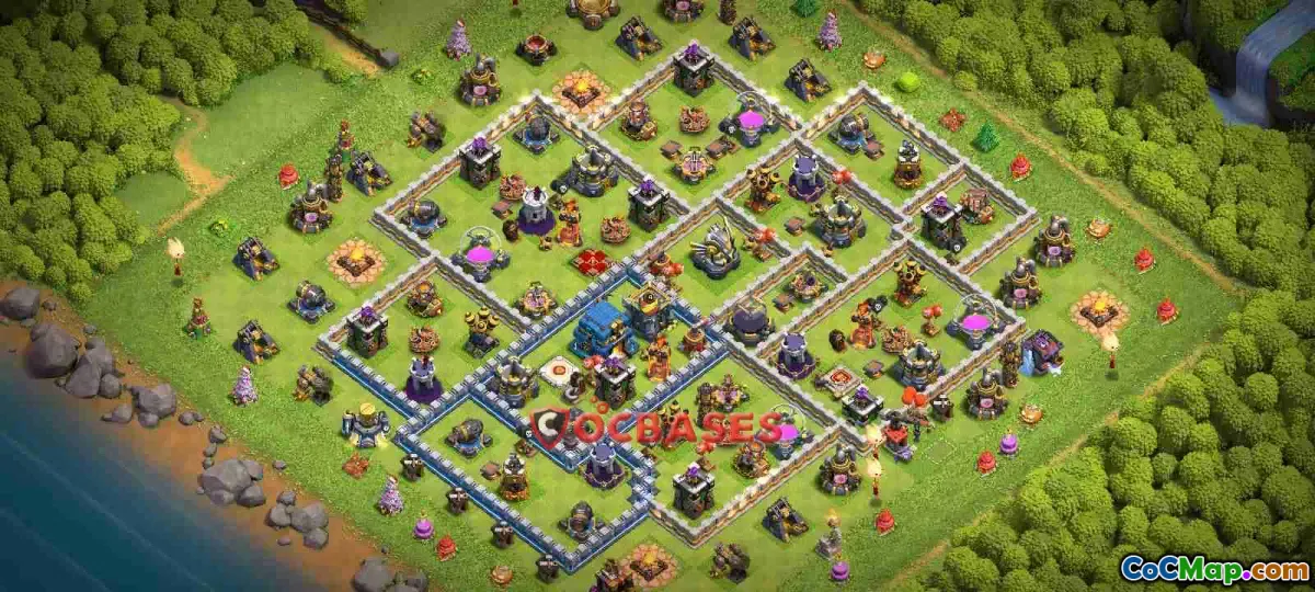 The base features a layout that prioritizes the protection of key structures like the Town Hall, which is typically placed in the center, surrounded by defensive buildings such as archer towers, cannons, and inferno towers. These defensive structures work together to create a formidable barrier for attackers, making it difficult for them to secure a victory. Additionally, anti-three-star bases incorporate traps strategically placed around the layout to catch opponents off-guard and disrupt their attacking strategies.