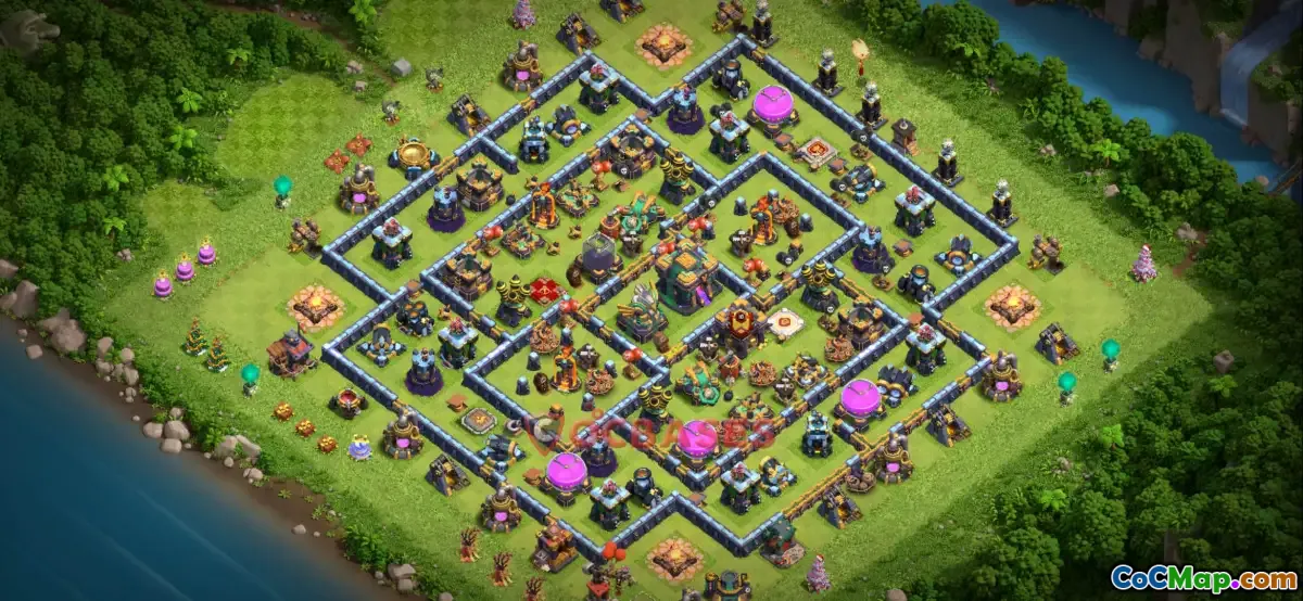 Discover the ultimate Town Hall 14 farming base layout! Featuring a symmetric design, anti-ground defenses, and trophy protection. Copy your base now!