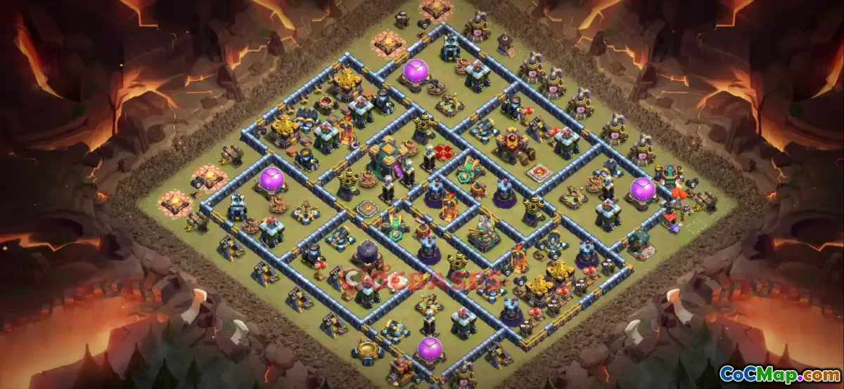 Discover the ultimate Town Hall 14 hybrid base for Clash of Clans! Compact design, anti-2 star strategy, and defenses against air and ground attacks.