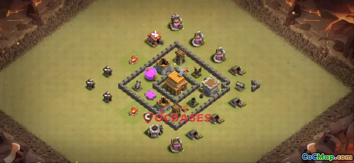 A Town Hall 4 war base in Clash of Clans is specifically designed to defend against enemy attacks during clan wars. At this level, players have access to limited defensive structures, so it’s important to optimize the layout to protect key resources and the Town Hall itself. Players typically aim to create a layout that spreads defenses effectively to minimize damage from enemy troops and spells. The strategic placement of walls, traps, and defensive buildings is crucial for a successful war base at this level.