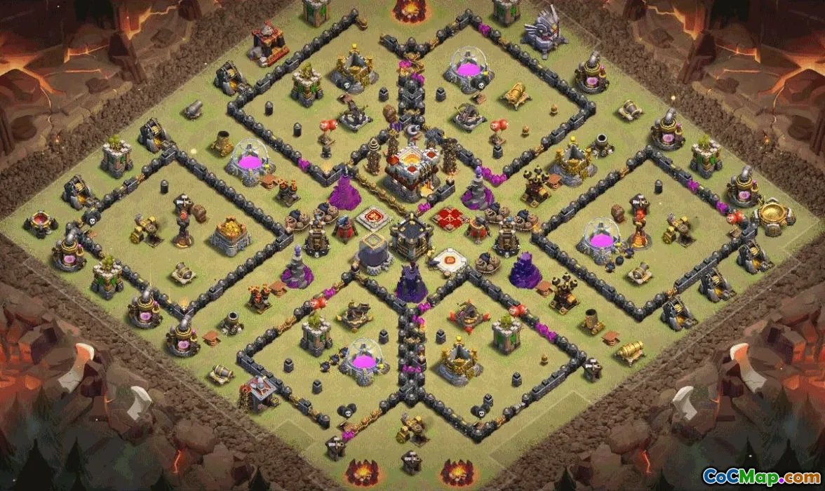 The designs balance defenses and storage, featuring a protected Town Hall, multi-layered compartments, and traps positioned to slow funnel breaches. Separate variants include a map-style coc map, a trophy-focused base, and a War base tuned for clan wars with strong core protection and flexible outer rings.