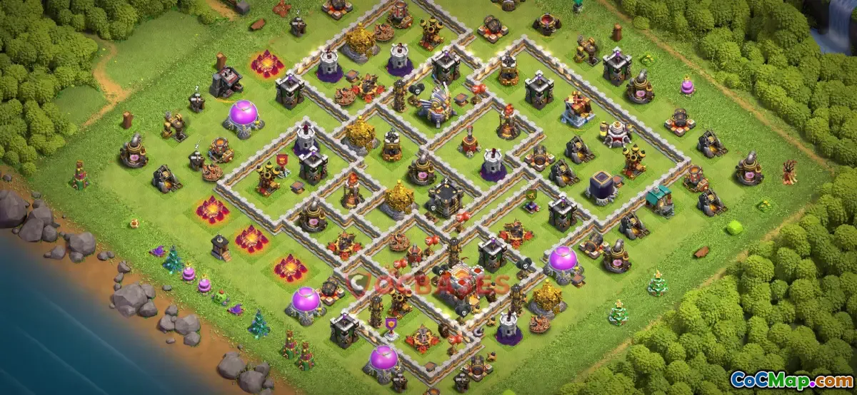 The Town Hall 11 trophy base in Clash of Clans is an essential layout designed to protect the player's trophies from being easily raided by opponents. This base setup typically includes strategic placement of defensive buildings, such as cannons, archer towers, and air defenses, arranged to defend the core and important resources effectively. The primary goal is to create a challenging layout that discourages attackers from breaking through and losing trophies, helping players maintain their ranking and progress in the game.