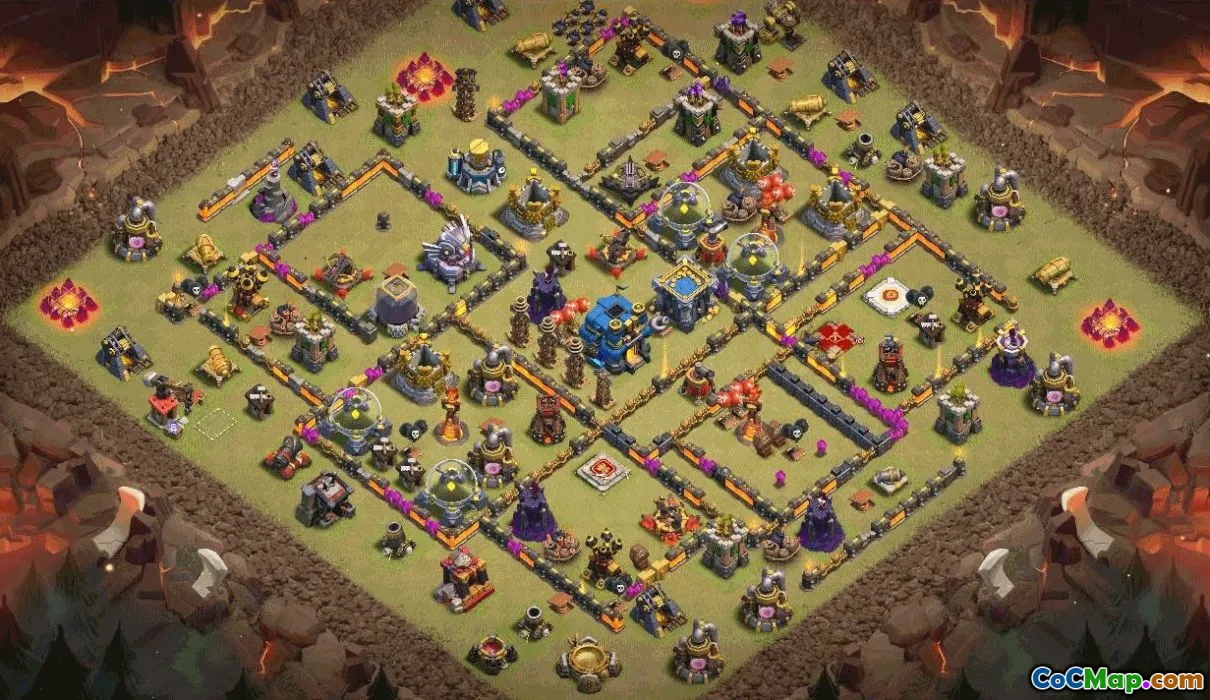 Core features center around a robust central compartment and layered defenses. The air and ground defenses reinforce each other, with traps and pathing designed to funnel heavy units away from key storages. This balance supports both trophy bases and war bases, while preserving resources for steady farming. The design adapts to the map layout and provides clear spawn paths that help either attacker or defender plan counter-strategies.