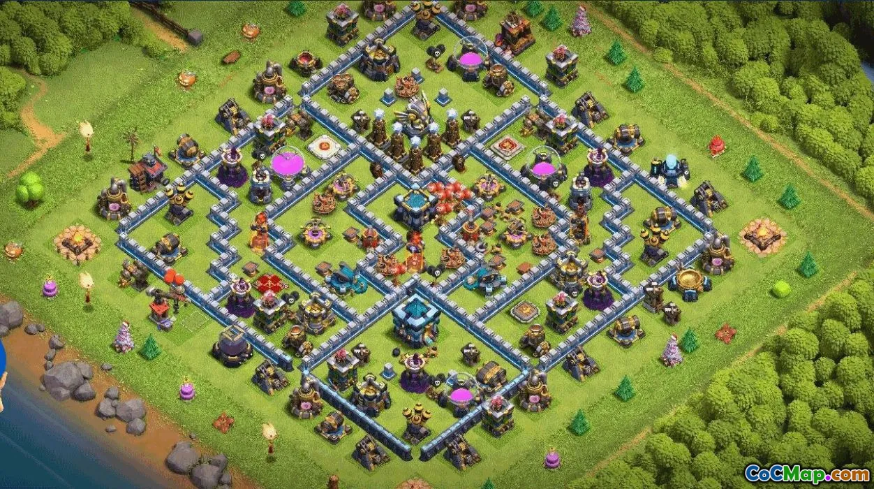 This copy-ready Town Hall 13 base layout is designed to serve as a versatile starting point for home village, trophy push, war, and farming in Clash of Clans. The layout is optimized for map variety and provides a clear path for funneling and defense. To use it, copy the design from this guide and apply it directly to your TH13 account. Copy base layout for Town Hall 13.