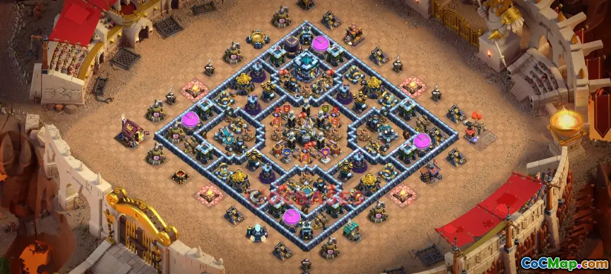 Farming bases at Town Hall 13 are optimized to safeguard resources like gold, elixir, and dark elixir, which are essential for upgrading troops, spells, and buildings. The key to an effective farming base is balancing security with accessibility; some structures are placed in ways that make it difficult for enemies to breach the defenses and reach the storages. Additionally, trap placements and the positioning of splash damage defenses play a crucial role in minimizing resource loss during raids.