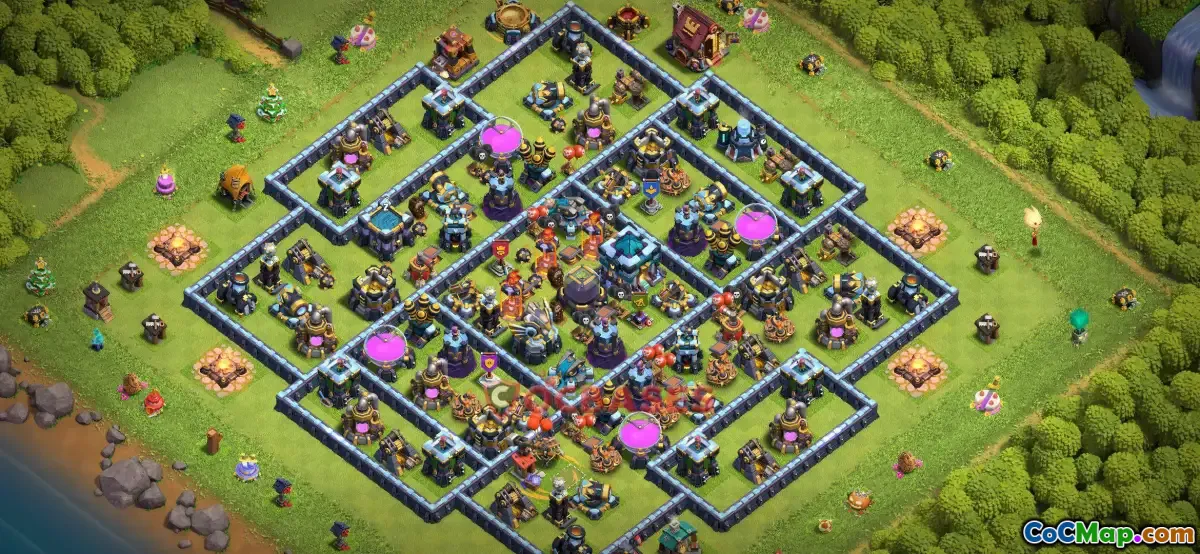 The Town Hall 13 farming base in Clash of Clans is strategically designed to protect your resources while allowing effective gathering. It typically features well-placed storages and defenses that discourage attackers from easily stealing valuable loot. The layout often includes a combination of walls, traps, and defensive buildings arranged to funnel enemies into kill zones or weak points, making it difficult for attackers to reach the core resources.