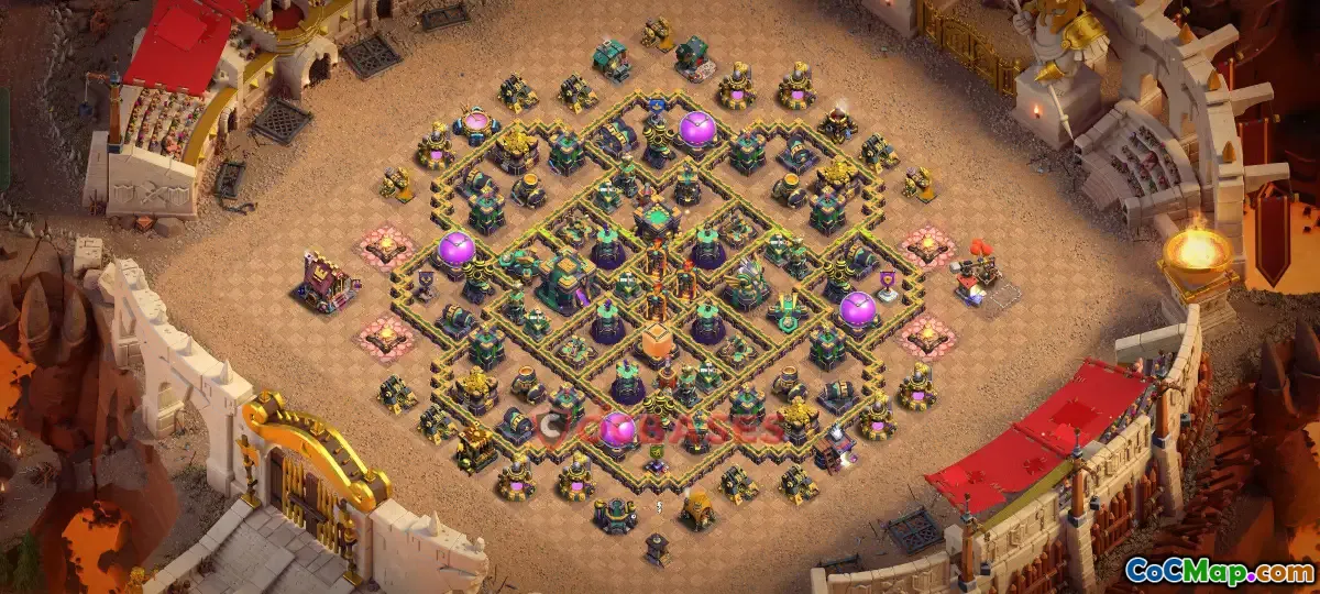 The Town Hall 14 hybrid base layout in Clash of Clans is designed to provide a versatile defense strategy that balances protection for both resources and the Town Hall itself. This layout often combines elements from farming and war bases, allowing players to defend their resources effectively while also safeguarding their Town Hall from attacks. By strategically placing defensive structures and traps, players can create a challenging environment for opponents attempting to launch attacks on multiple fronts.