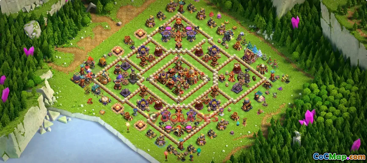 This design emphasizes a well-balanced structure that safeguards key resources and the Town Hall. The layout's strategic positioning of archer towers, air defenses, and splash damage units creates a robust defense system. Players can easily copy this base to strengthen their defenses and improve their chances in clan wars and multiplayer battles, making it a must-try for TH16 enthusiasts.