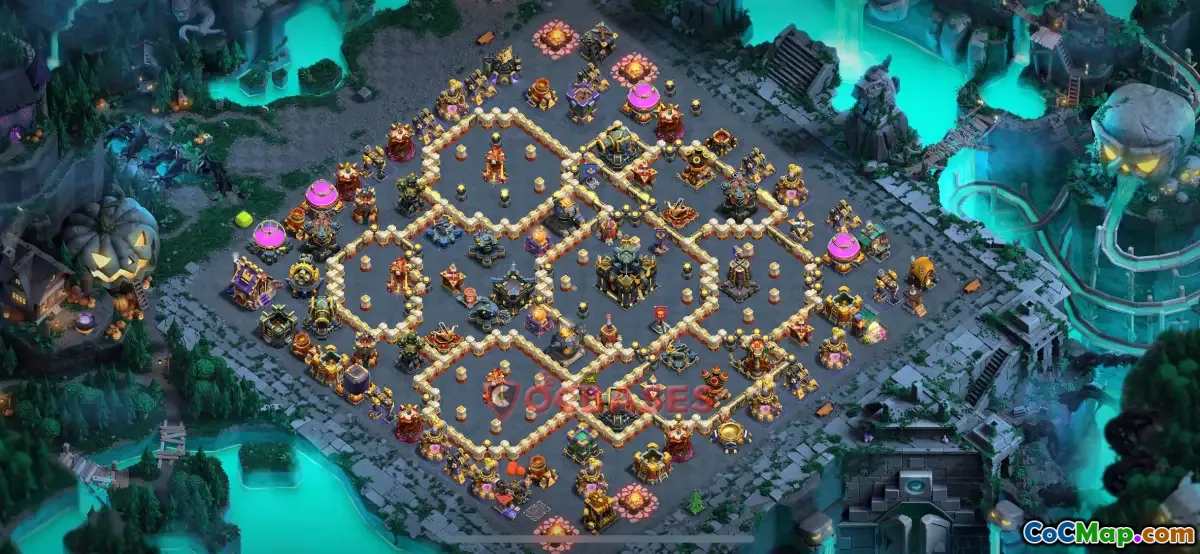The Town Hall 17 hybrid base design in Clash of Clans is an advanced and strategic layout aimed at providing a balance between defending against both attacking styles—rushes and full-scale invasions. This type of base combines elements of defensive placement and resource protection, making it a versatile option for many players. The hybrid design typically integrates well-protected resource storages and an efficient layout that confuses attackers while minimizing vulnerabilities.