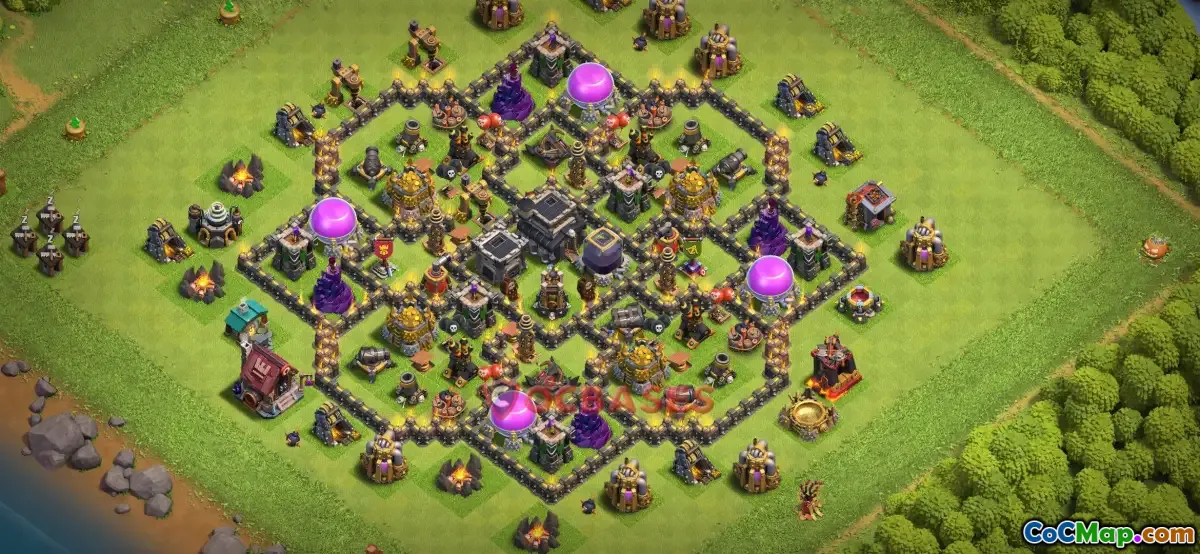 The Town Hall 9 farming base in Clash of Clans is designed primarily to maximize resource collection and protection. It typically features well-placed defenses such as cannons, archer towers, and mortars to defend against enemy attacks while allowing the player to farm efficiently. The layout often emphasizes resource storages placement to minimize the risk of losing valuable loot, with resource collectors strategically positioned within the protected core of the base.