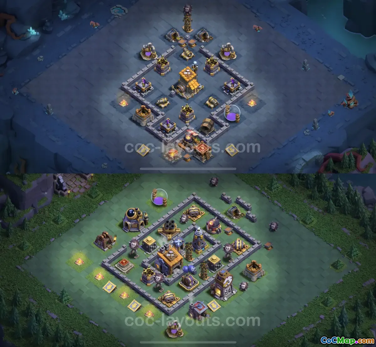 Designen innehåller också fällor, såsom fjäderfällor och bombfällor, som placeras i förväntade banor för fientliga trupper. Den här aspekten av layouten syftar till att fånga angripare ur vakt, ytterligare försvaga deras attack och göra det utmanande för dem att uppnå en trestjärnig seger. Genom att effektivt använda fällor förbättrar den här designen de defensiva kapaciteterna hos Builder Base och lägger till ett element av oförutsägbarhet för angripare.