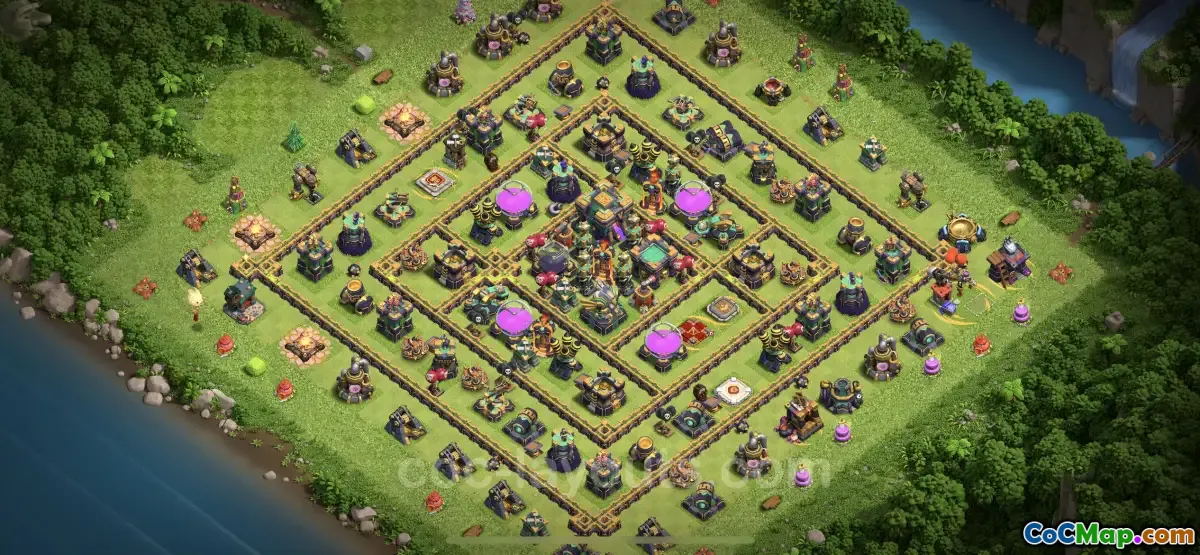 This base copy is specifically tailored for Town Hall 14, incorporating advanced defensive tactics that leverage the unique features and capabilities available at this level. The design takes into consideration the placement of key structures such as defenses, traps, and the Town Hall itself, ensuring that attackers face numerous challenges throughout their assault. Effective base design is crucial in the game, as it can lead to improved win rates and protect valuable resources from being plundered.
