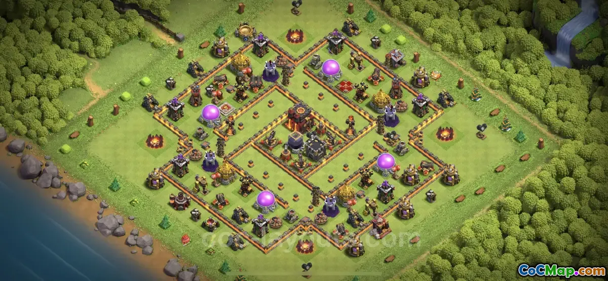 This Clash of Clans Town Hall 10 base design is specifically tailored for players focusing on trophy collection while enhancing their defensive capabilities. It features a hybrid layout, which is strategically constructed to prevent opponents from securing three stars during attacks. The design offers a balanced approach, allowing for effective defense against both ground and air troops, making it an ideal choice for players looking to maintain their trophies.