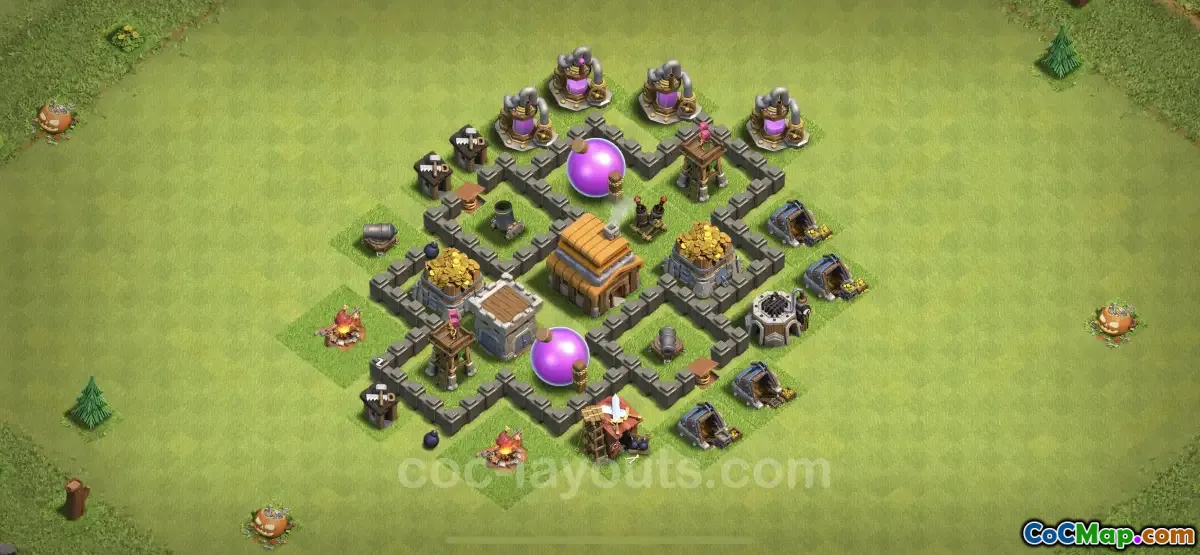 Tipik bir TH4 max yükseltme temel tasarımı genellikle okçu kuleleri ve toplar gibi savunma kulelerinin yanı sıra stratejik olarak yerleştirilmiş toplayıcılar ve depoların bir karışımını içerecektir. Düzen, rakiplerin kaynak depolarına erişmesini zorlaştırmayı ve oyuncuları savunmalarını yükseltmeye yatırım yapmaya teşvik etmeyi amaçlıyor. Oyuncular farklı düzenleri keşfettikçe sıklıkla karşılaştıkları saldırı stratejilerine göre ayarlamalar yapabilirler.